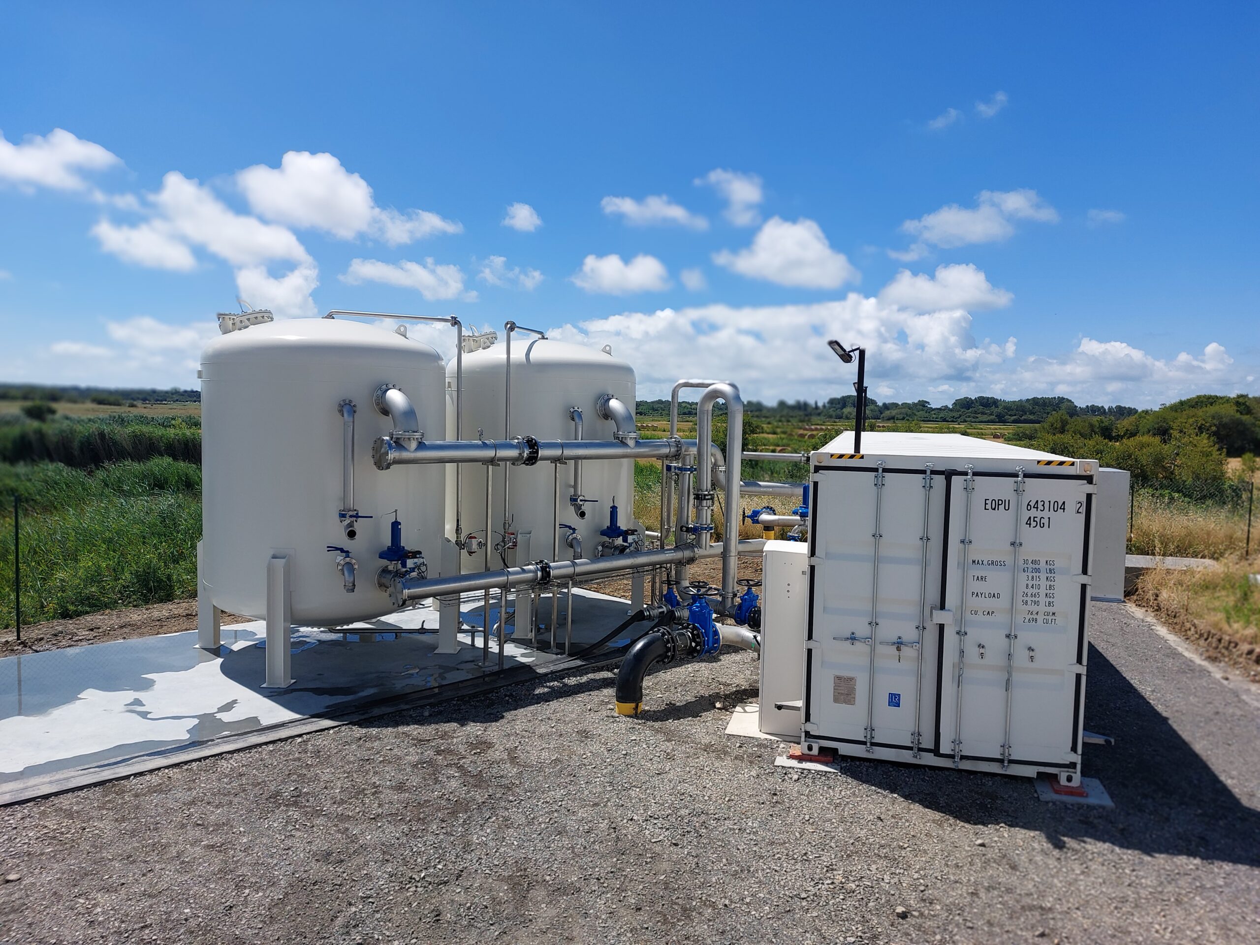 Réalisation d’une unité provisoire pour le traitement de la turbidité par une filtration fermé bicouche d’un forage. Le filtre est intégré dans une unité de traitement pesticides sur CAG